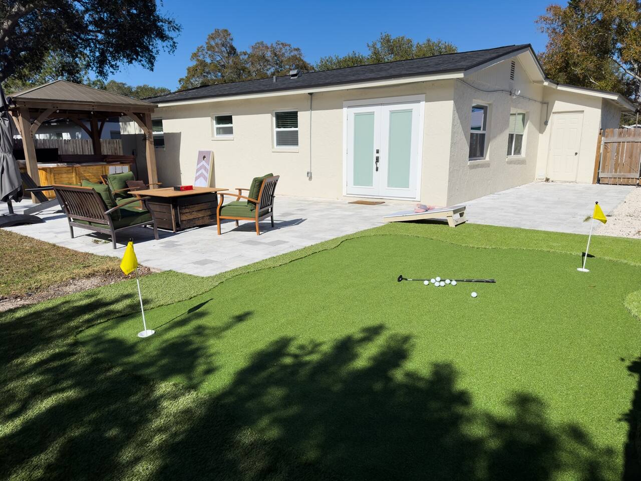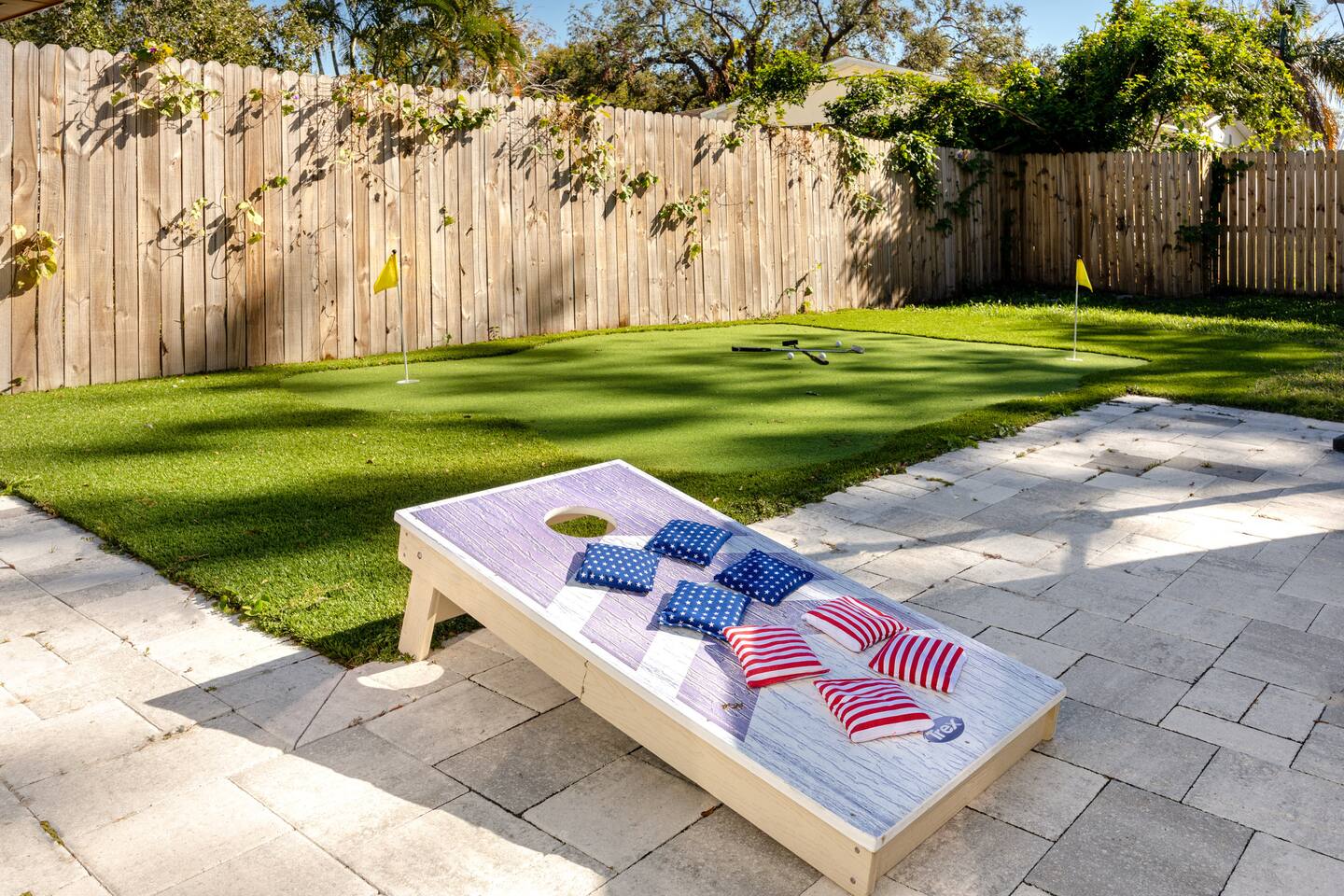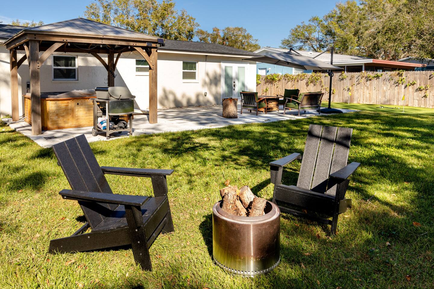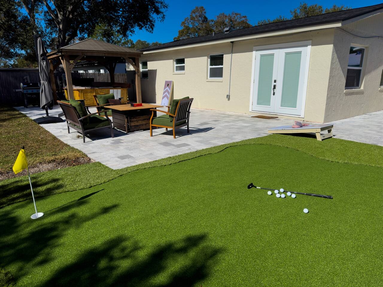 Step into your private backyard paradise, where adventure and relaxation collide: Soak your cares away in the luxurious hot tub under the stars36 Gather 'round the fire pit for s'mores and storytelling3 Challenge your family to a friendly game of mini-golf on your personal putting green Sleeping arrangement 3 bedrooms with a queen bed in each. There is also a pack and play Bathrooms There is a bathroom with standing rain shower by the entrance door There is also another bathroom with tub between the bedrooms